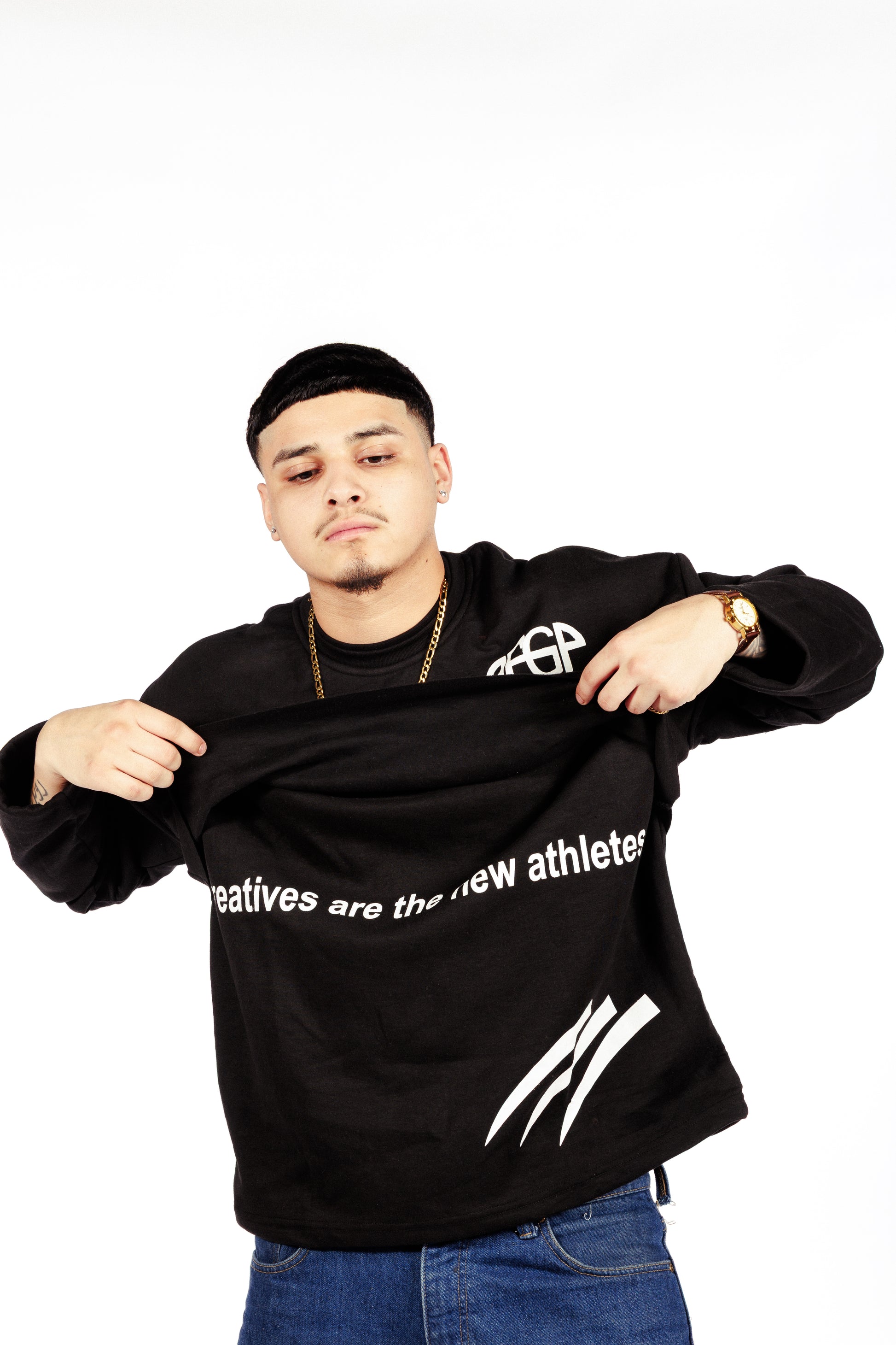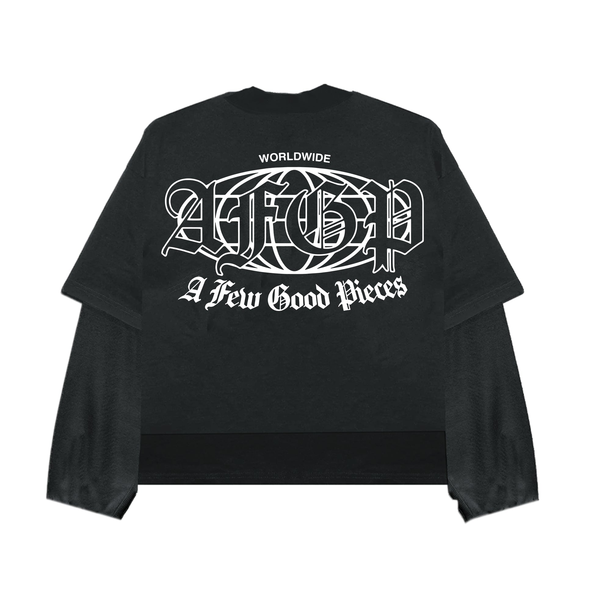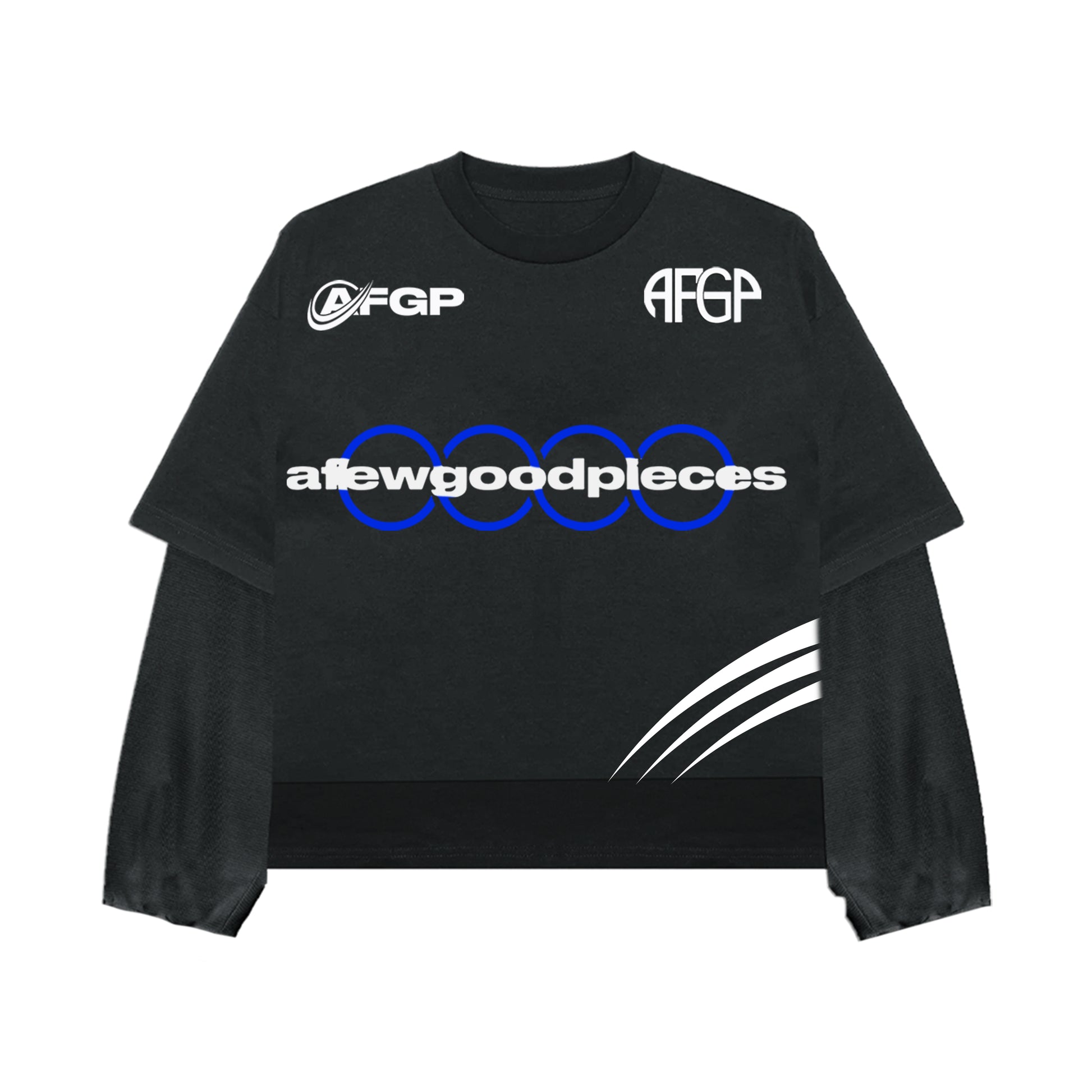 Product Description: Redefine your streetwear wardrobe with the AFGP "Layered Vision" Long-Sleeve Tee. Designed with a unique double-layered effect, this tee pushes the boundaries of casual fashion while staying true to AFGP’s signature boldness. The chest features the iconic AFGP logo and a striking "A Few Good Pieces" print in interlocking blue rings, symbolizing unity and strength. White claw mark details near the hem add a dynamic touch, giving the tee an extra edge. Its relaxed fit and premium fabric make this a versatile piece for everyday wear, whether you're in the studio or out on the streets.